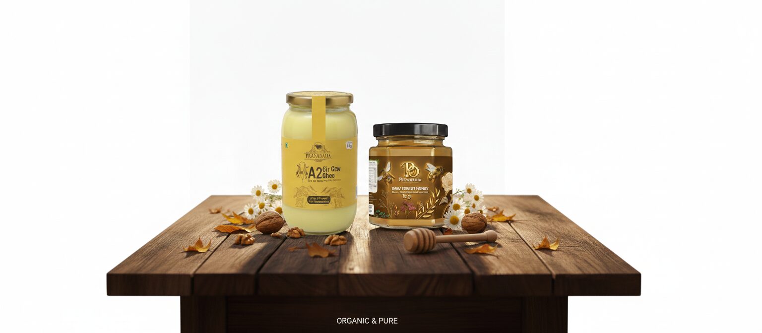 Experience the purity of authentic A2 Gir Cow Ghee and Raw Honey, crafted traditionally and delivered fresh to your doorstep.